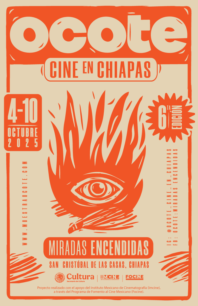 OCOTE: Miradas Encendidas, Festival de cine en Chiapas, 6ta edición. Recopila y comparte las nuevas películas, como brasas que arden, iluminan y resguardan miradas diversas, historias que resisten, memorias que se proyectan en la pantalla como un eco colectivo